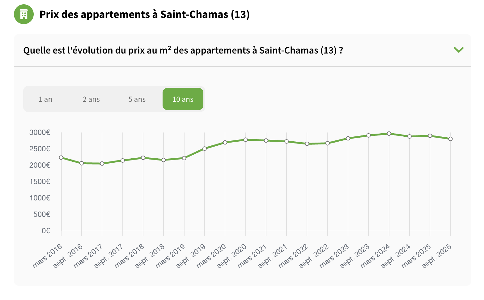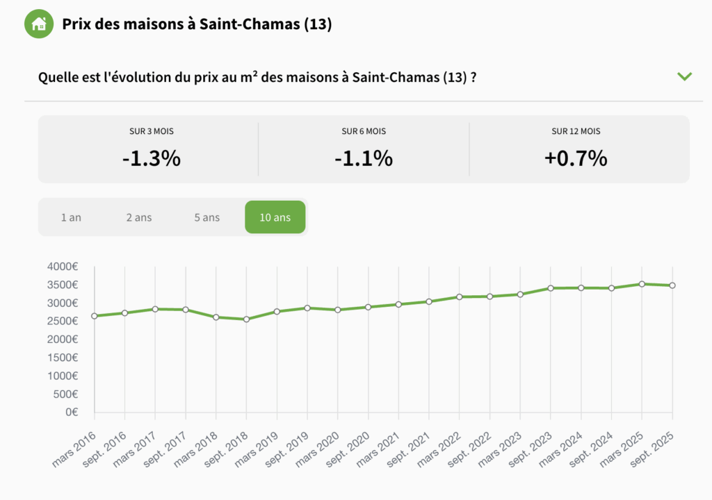 Sur 9 ans, le prix au m² a enregistré une hausse de 23,5% pour les maisons et 17,8% pour les appartements 📈Saint-Chamas (13250): Prix m2 & Prix Immobilier août 2025 · EUR / m² | RealAdvisor, confirmant l’attractivité croissante de Saint-Chamas pour l’estimation immobilière.